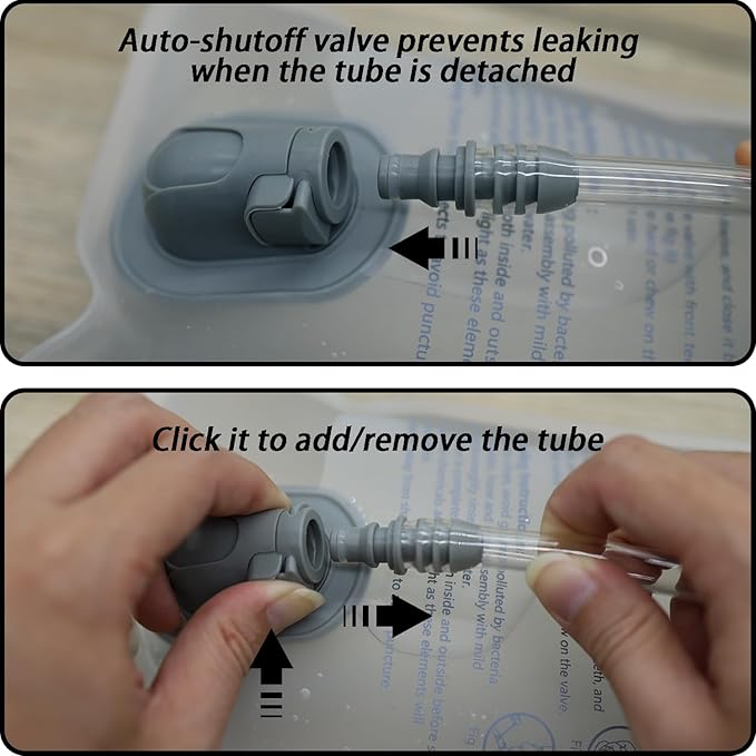 • UPGARDE LEAK PROOF: Soft yet durable mouthpiece with easily accessible ON/OFF valve non-leaking. You can control the water flow by biting, First pull up on the drinking cap, gently bite the mouthpiece with your front teeth to have a sip and start drinking, push back to stop water flow. Quick-release tube is detachable. Auto shut off while the tube is removed, The hydration bladder will stay filled non-leaking. The bladder bags also has a dust cover to keep dirt out.