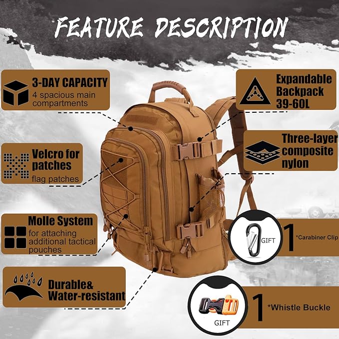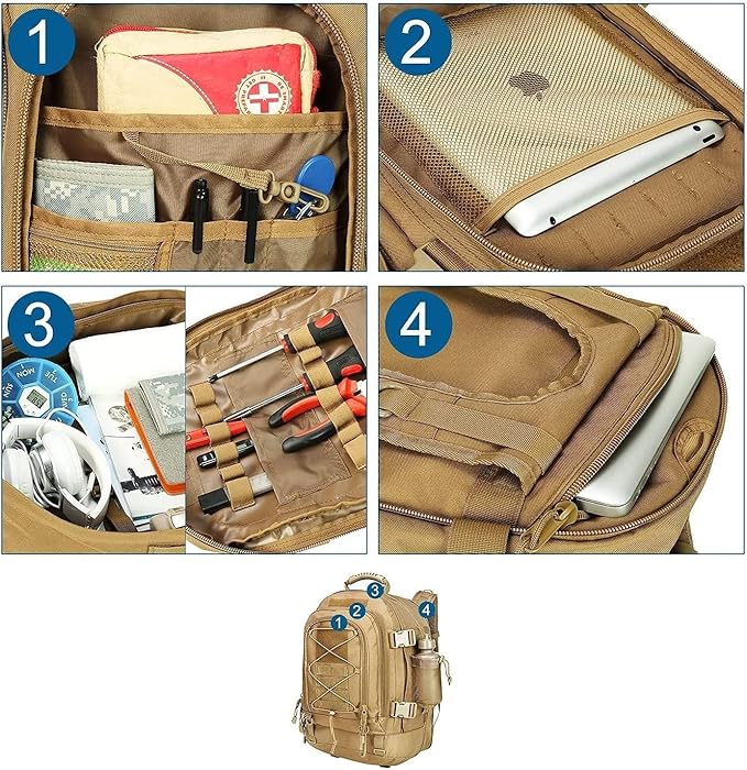 • ✅ Effective: There's plenty of compartments to store and organize your life. The pack holds 3 days worth of clothes along with toiletries and other essential gear. A solid multifunctional backpack for combat, range, survival or hunting. It is water resistant keeping everything dry in a storm.