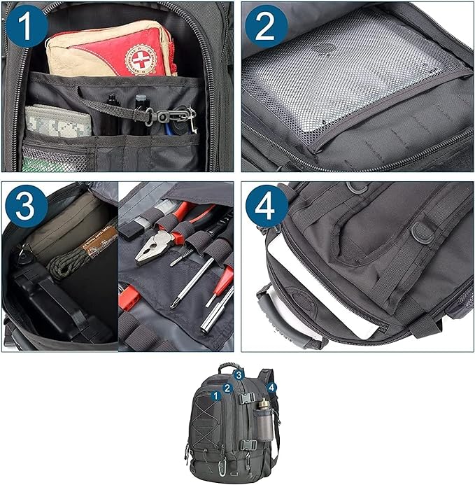 • ✅ Effective: There's plenty of compartments to store and organize your life. The pack holds 3 days worth of clothes along with toiletries and other essential gear. A solid multifunctional backpack for combat, range, survival or hunting. It is water resistant keeping everything dry in a storm.