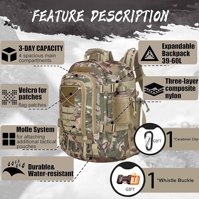 • ✅ Effective: There's plenty of compartments to store and organize your life. The pack holds 3 days worth of clothes along with toiletries and other essential gear. A solid multifunctional backpack for combat, range, survival or hunting. It is water resistant keeping everything dry in a storm.