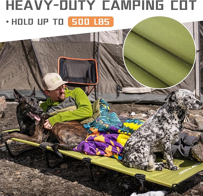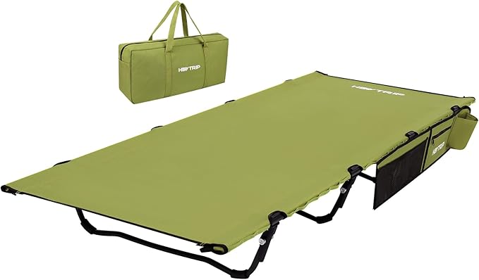 HEYTRIP Extra-Wide Camping Cot, Upgrade Sturdy Camping Bed, XXL Cots for Sleeping Support 500lb, Folding Cot with Side Pocket, Carry Bag Ultralight Backpacking Cot for Travel(Green)