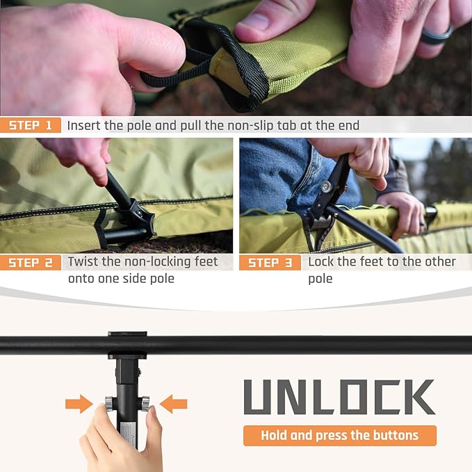 • Organized & Quick-access: camping cots for adults with roomy side pockets and MOLLE straps. The side pockets are detachable and can be moved to any seat of the side. You can keep your phone, books, water bottles, and other camp gear clean and dry. The MOLLE straps can attach camping essentials and giving you even more storage options within arm's reach.