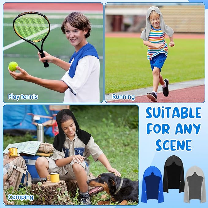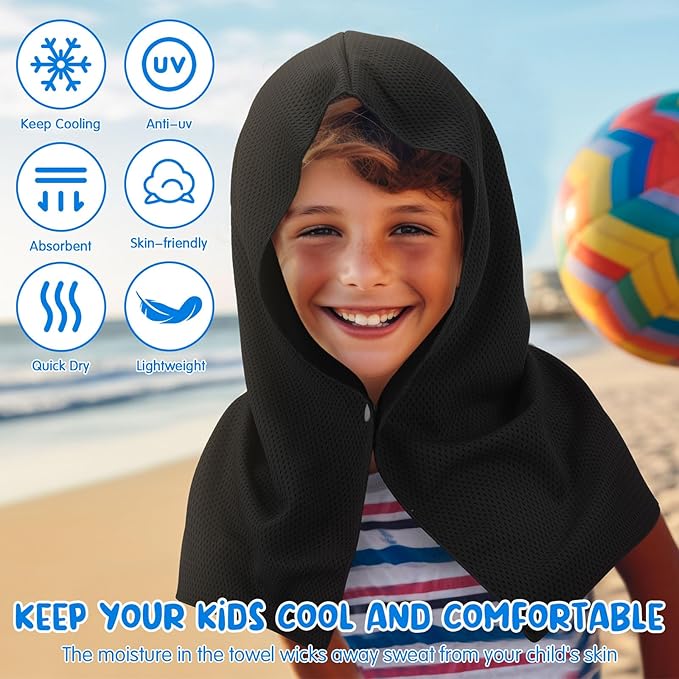 • Hooded Integrated Design: each absorbent polyester cooling neck towel is designed with a convenient hood that keeps it in place and provides more coverage, even during active play; Additionally, it features a button on the neck for secure and easy wearing, allowing your children to fully engage in their activities without the towel slipping off