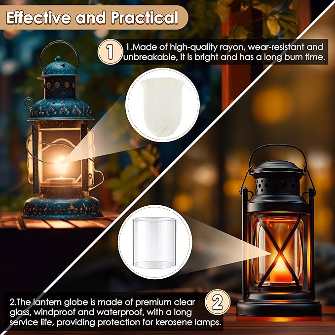 • [Quality Material]: these propane lantern mantles are made of rayon, wear resistant and unbreakable, it is bright and has a long burn time; The lantern globe is made of quality glass, windproof and waterproof, with a long service life, providing protection for kerosene lamps; These lantern mantles and lantern replacement globe are the good substitute for your lantern or gas lamps