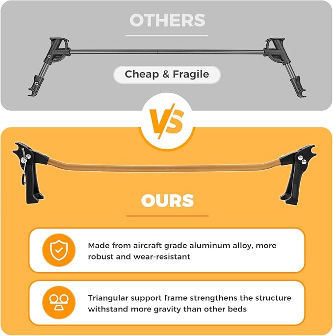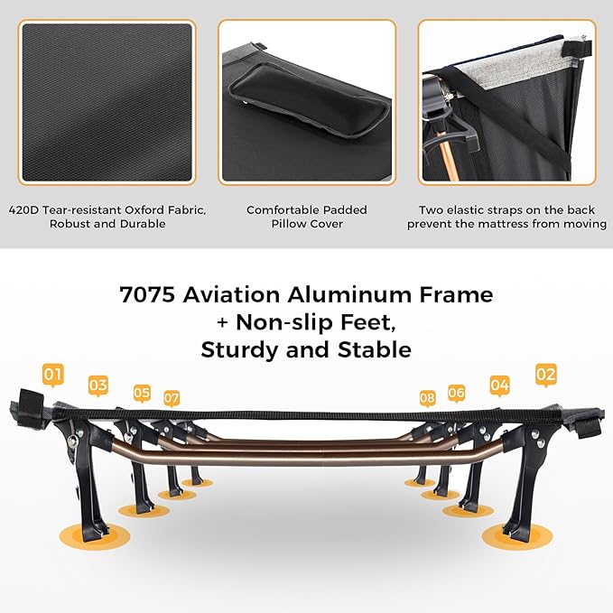 • 【Heavy-Duty & Long-Lasting】Made with 7075 aerospace-grade aluminum and tear-resistant cationic fabric,this heavy duty camping cot supports up to 265lbs.Oversized anti-slip feet add ground stability, while anodized coating protects the frame from rust and corrosion.