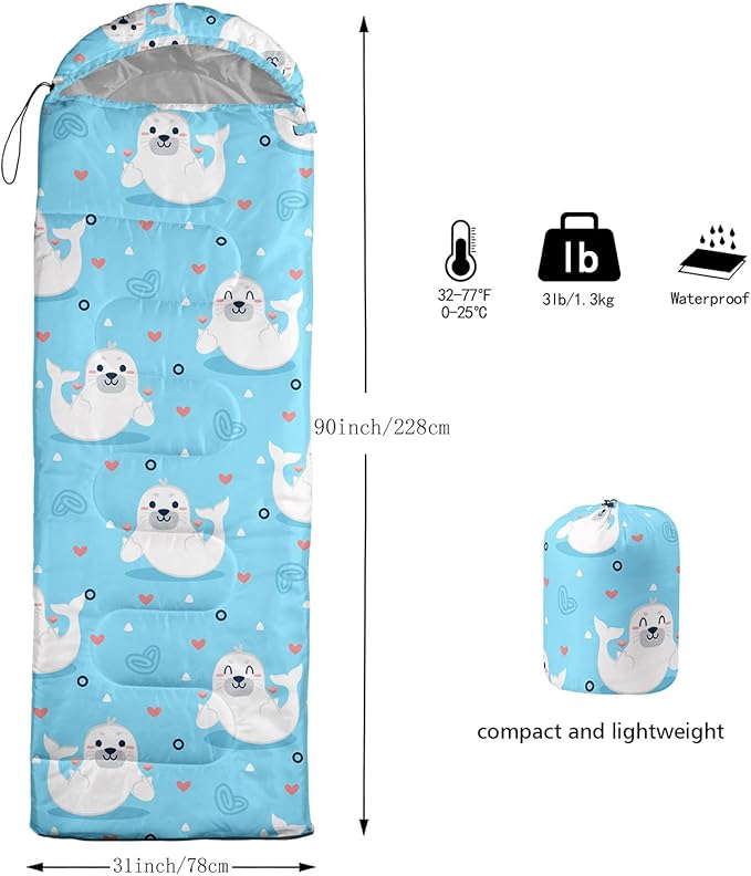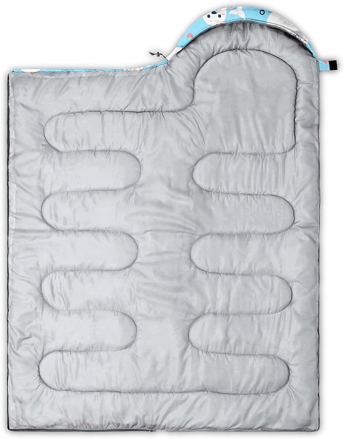 • SUITABLE:The sleeping bag can be used for 3 Seasons.SIZE:90.5"L x 31.5"W Suggenal extreme temperature: 41 ℉ -77 ℉.Applicable in a variety of scenarios,such as Travel camping pajamas party,It's very suitable for you to travel with your children.Half-circle hood with adjustable drawstring,which can keep you warm and prevent your humidity