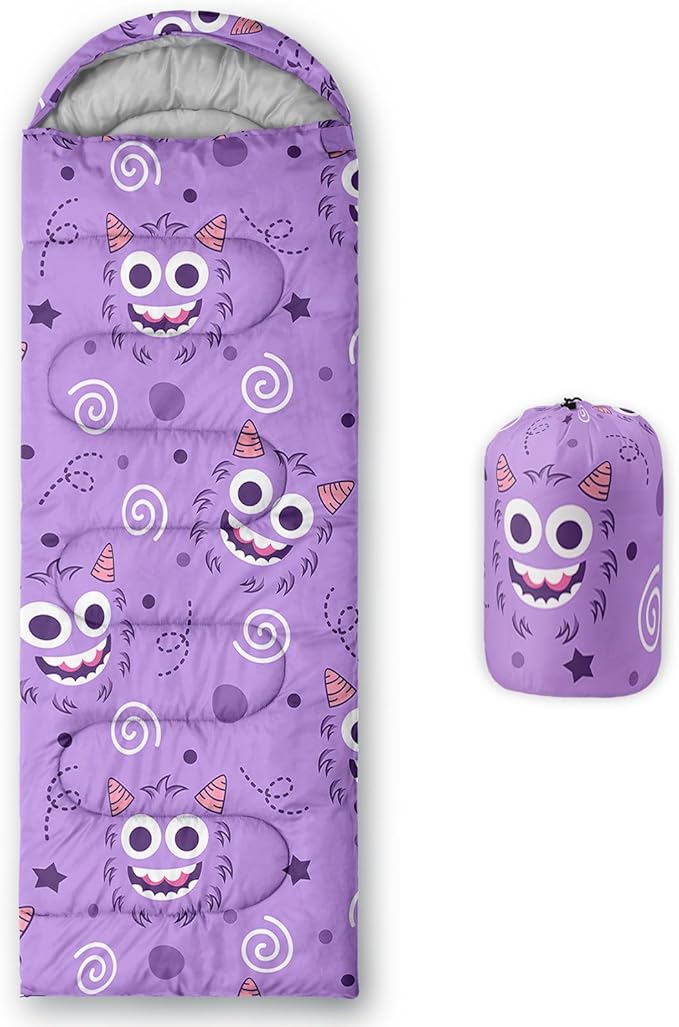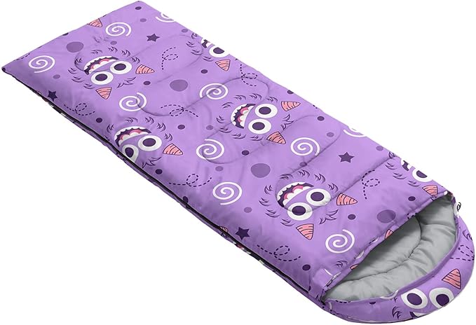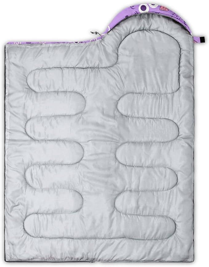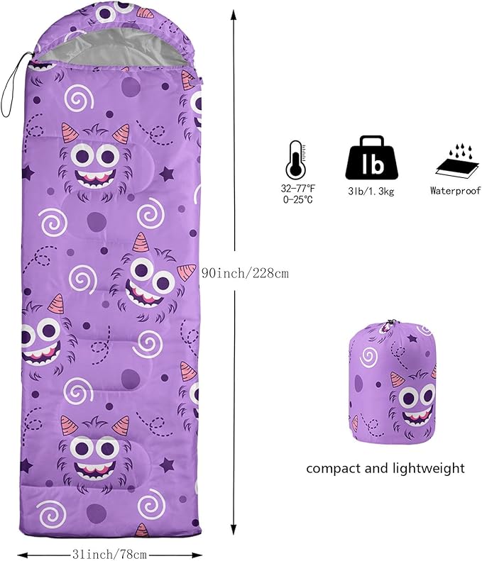 • SUITABLE:The sleeping bag can be used for 3 Seasons.SIZE:90.5"L x 31.5"W Suggenal extreme temperature: 41 ℉ -77 ℉.Applicable in a variety of scenarios,such as Travel camping pajamas party,It's very suitable for you to travel with your children.Half-circle hood with adjustable drawstring,which can keep you warm and prevent your humidity