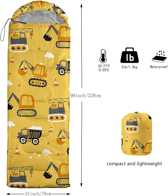 • SUITABLE:The sleeping bag can be used for 3 Seasons.SIZE:90.5"L x 31.5"W Suggenal extreme temperature: 41 ℉ -77 ℉.Applicable in a variety of scenarios,such as Travel camping pajamas party,It's very suitable for you to travel with your children.Half-circle hood with adjustable drawstring,which can keep you warm and prevent your humidity