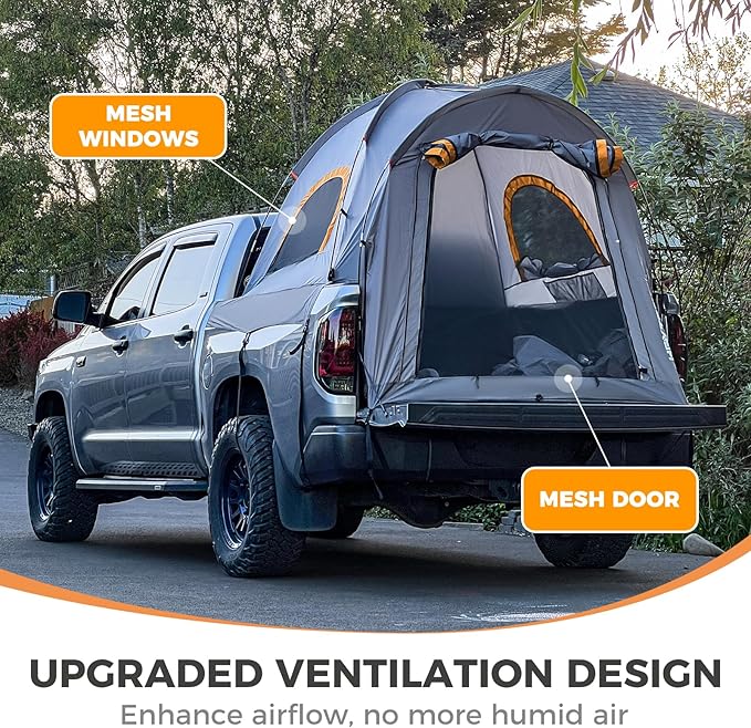 • Upgraded Ventilation: This tent for pickup truck is designed with 1 large entrance door, 2 big side mesh windows, all double-layered for optimal ventilation. The large mesh windows enhance airflow, keeping the inside temperature regulated and comfortable.
