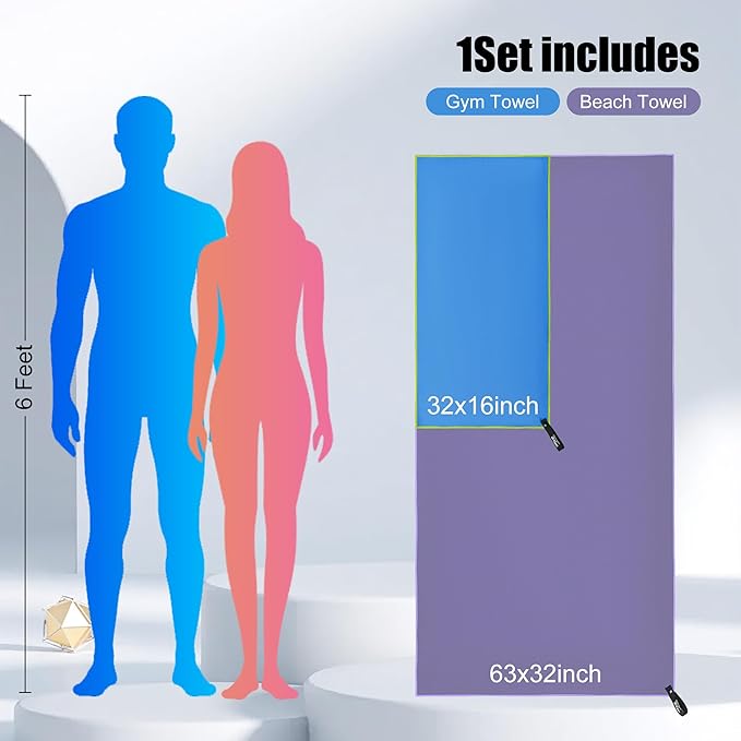 • ULTRA-LIGHT & CONVENIENT: Each set boasts two ultra-lightweight travel towels, measuring 63"x32" and 32"x16". Use them as swim towels, gym towels, or small beach towels on your next vacation.