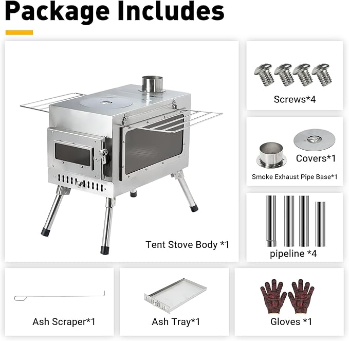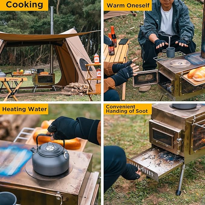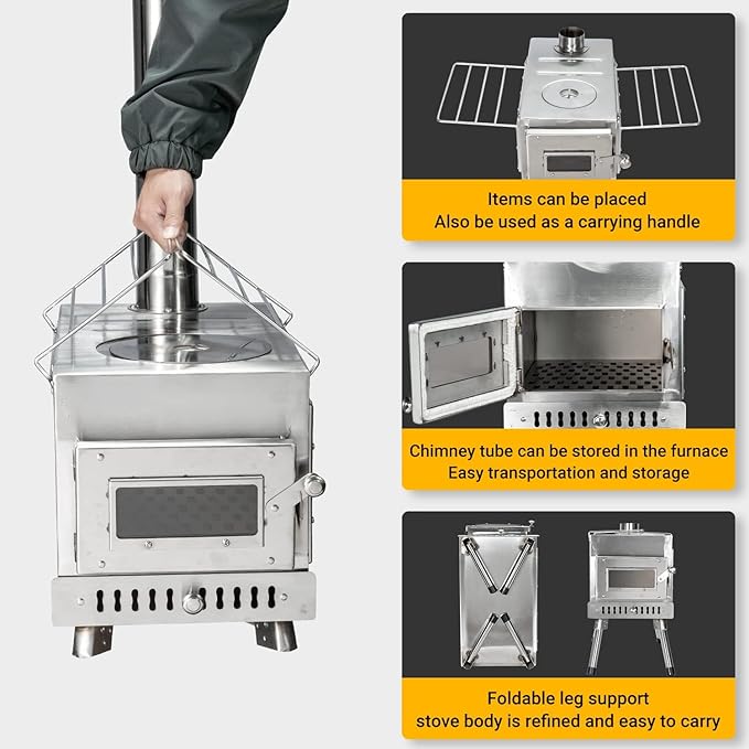 • ⛓【Stainless Steel Chimney Pipe】-- Equipped with 4x chimney pipes for stability and proper ventilation. Available for bell tents with furnace tube vents; chimney tubes adjust ventilation to suit your heat needs. The design of the fire holes on the surface of the stove also increases the heating efficiency and is a great version for your camping/hunting trips with friends or family.