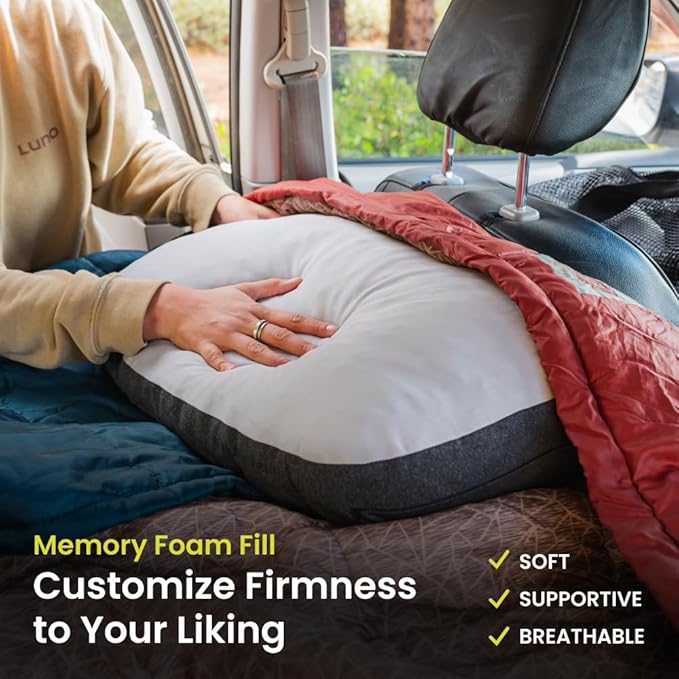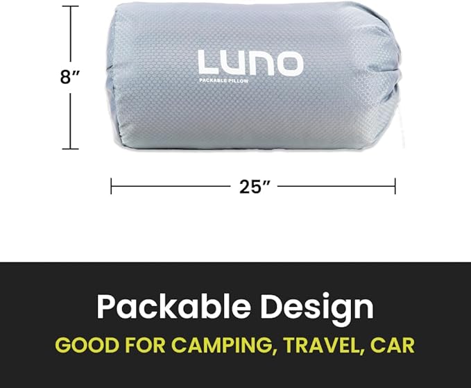 Luno Camping Pillow - Travel Friendly, Packable, Shredded Memory Foam Fill Travel Pillow. Washable Removeable Cover with Dual-Sided Comfort. Designed in The USA.