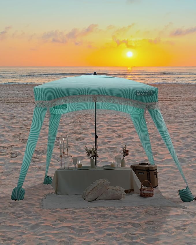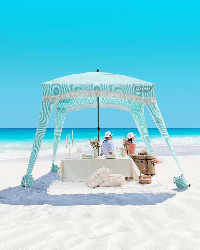 OutdoorMaster Beach Cabana with Fringes, Portable 6' x 6' Beach Canopy for Sand, Easy Set Up Sun Shelter, Included Side Wall, UPF 50+ UV Protection Sun Umbrella - for Family & Friends -Stripes