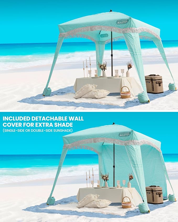 • UV50+ Protection Shade for 4 Person: Beach cabana with fringes, adds romantic moments to your vacation. The detachable side wall blocks angled sunlight for extra shade and privacy. Featuring UPF 50+ sun protection, it shields your skin from harmful UV rays and prevent sunburn - perfect for families, kids.