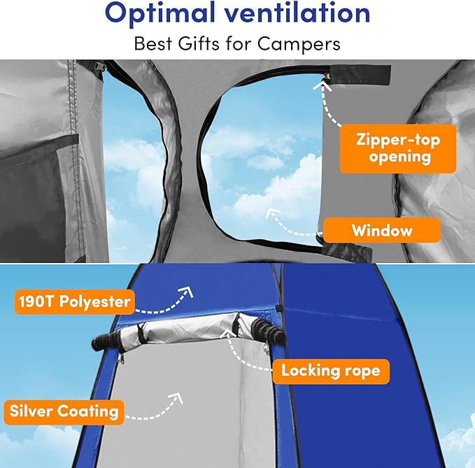 • POP UP PRIVACY TENT: This pop up privacy tent provides the ultimate solution for your outdoor adventures. You not only get to enjoy a cozy shower but also have the convenience of changing and freshening up inside the pop up privacy tent. It's also the ultimate shelter for a portable toilet on the go! Enjoy a refreshing shower and a private space wherever you go