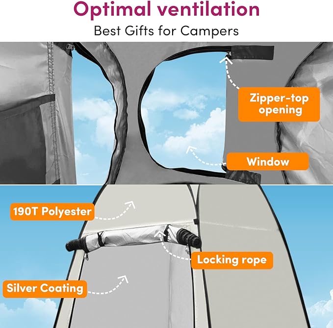 • POP UP PRIVACY TENT: This pop up privacy tent provides the ultimate solution for your outdoor adventures. You not only get to enjoy a cozy shower but also have the convenience of changing and freshening up inside the pop up privacy tent. It's also the ultimate shelter for a portable toilet on the go! Enjoy a refreshing shower and a private space wherever you go.