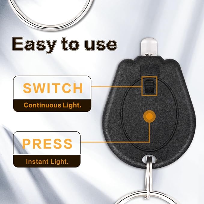 • Two Easy Use Methods: (1)Instant Key Light: Slightly pinch the middle of the red keychain flashlights with your two fingers to activate instant red light; (2)Continuous Light: Slide the On/Off Switch to turn on or turn off the mini red light keychain flashlight.