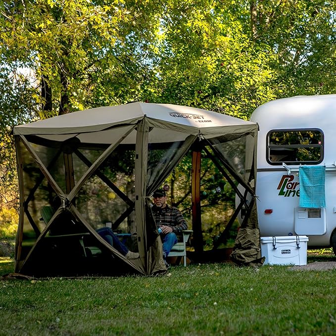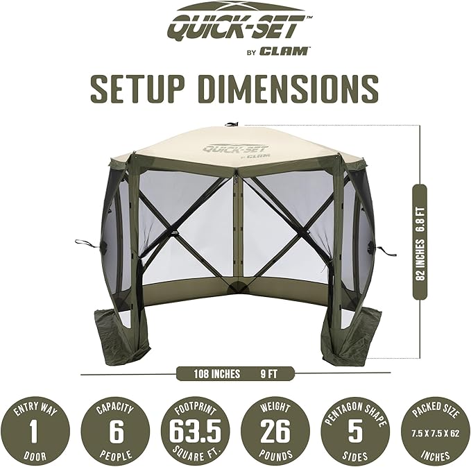 CLAM Pop Up Screen Tent, Outdoor Camping Gazebo Canopy, Venture, 9', Green/Tan