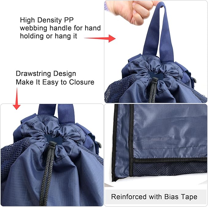 • Handle Design & Comfortable Adjustable Straps: The drawstring backpack has a high-density pp webbing handle for hand-holding or hanging. And adjustable straps of this gym backpack can fit any kind of person. Backpack design can free up your hands. It's more convenient to use a drawstring seal to keep your stuff safe. Our drawstring swim bag is perfect for the gym bag, swim bag, workout gear bag, basketball bag, soccer bag, sports bag, and beach gear bag.