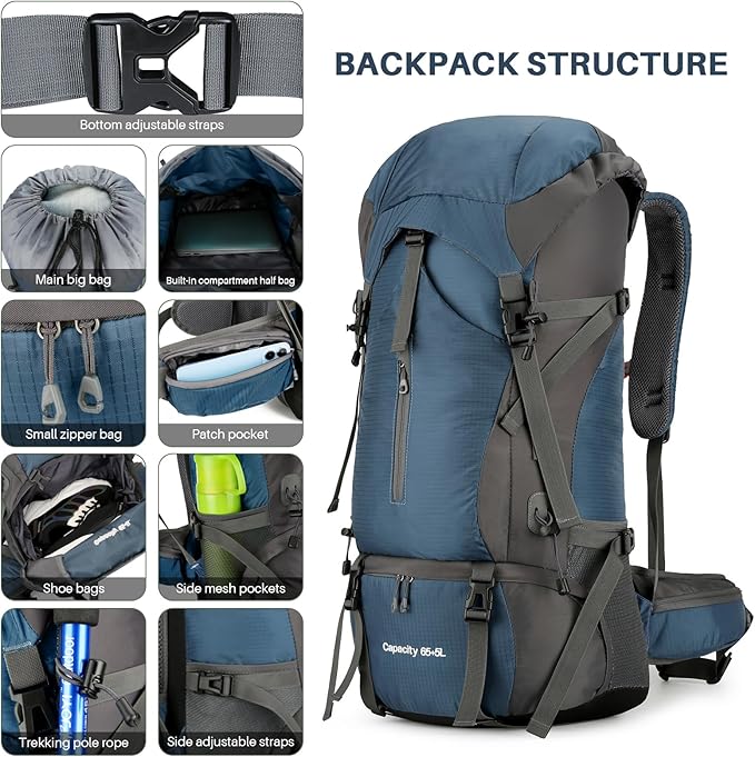 • 🎒Spacious Smart Design: Are you tired of fumbling around for your gear? Our hiking backpack has you covered with a large main compartment for all your essentials and smartly designed pockets for easy organization and access. Plus, a bottom section to keep things tidy