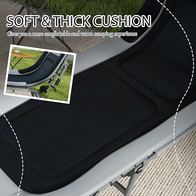 • Soft, Cushioned Camping Bed: Wake up refreshed, sleeping on a surface that's kind to your head and neck. Raised up off the ground with a soft, cushioned surface and a pillow to pad your head, our camping cot is built to bring you a higher level of comfort even on rough terrain.