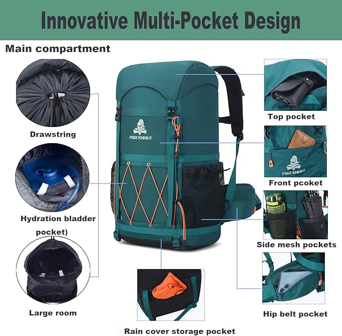 • Multi Compartment: Generous main compartments and multiple pockets keep all your gear safe and organised. The spacious main compartment can holds sleepingbag, clothes or other everyday essentials. With an internal pocket for water bladder. There is also a front zip pocket. The elastic cord is designed to store items that need to be easily accessible. It also has two side pockets for your water bottle or umbrella.