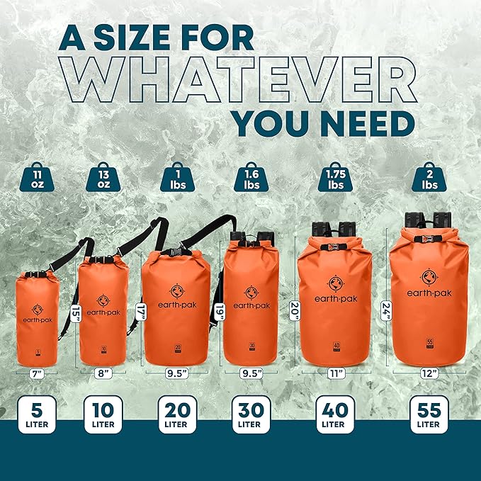 • RELIABLE PROTECTION: We believe our earth pak dry bags are the best out there--bar none. These dry bags are meant to last for years and provide waterproof protection for even the most rugged users.