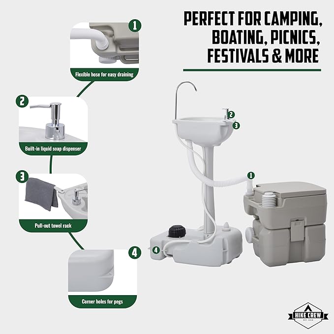 • PERFECT FOR CAMPING, BOATING & FESTIVALS | Hike Crew’s Versatile Personal Care Equipment Stands Up to Frequent Use & Suits a Variety of Outdoor Settings & Events Where Plumbing/Running Water is Not Available | Use Your Portable Sink & Toilet for Camping & Fishing Trips, RV Outings, Picnics, Concerts, Farmer’s Markets, Tailgates & Sporting Events