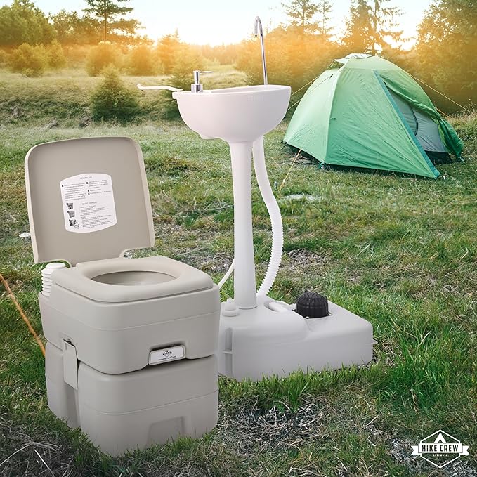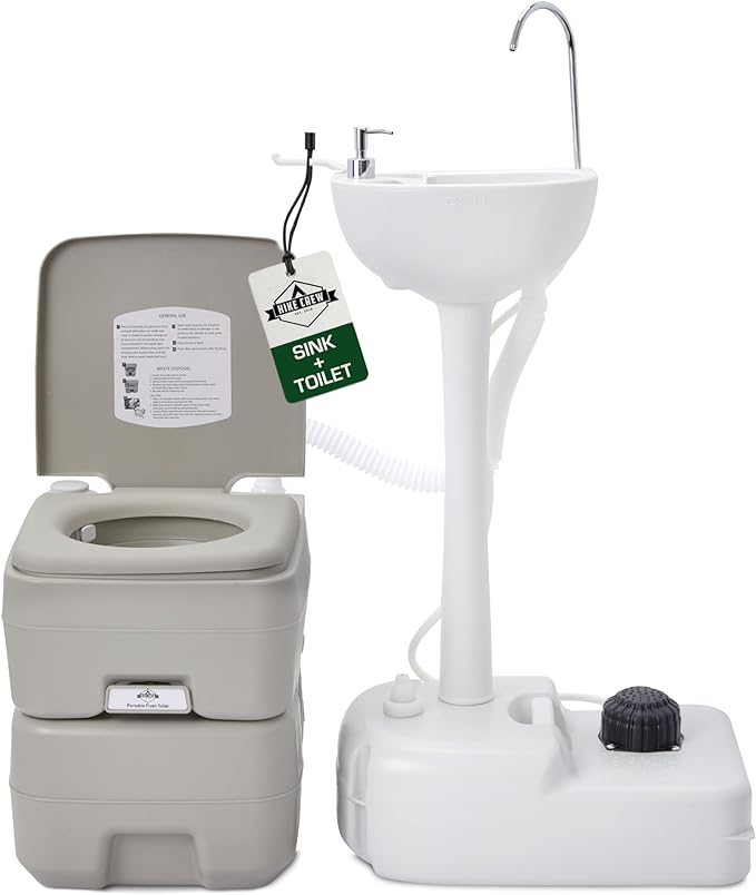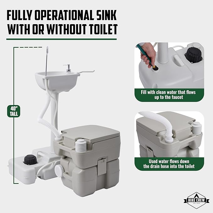 Hike Crew Portable Camping Sink & Toilet | Large Hand Washing Station with 4.5 Gal Capacity, Hands-Free Foot Pump, Faucet, Soap Dispenser & Towel Rack | Includes Travel Toilet with 5 Gal Waste Tank