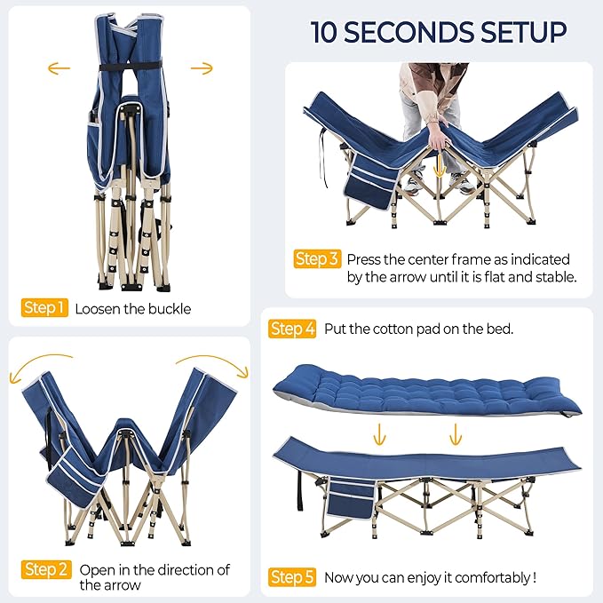 • Comfort-upgraded Camping Cot: This upgraded outdoor cot comes with an 8 cm/ 3.1" thick soft mat with a 90g Polyester cover and premium filling. To prevent the uneven distribution of the filling after using it for a while, outside the mat is sewn with thread vertically and horizontally, making the filling fixed in the specific area