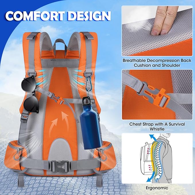 • 【More Comfortable】With breathable and adjustable shoulder straps, the camping backpack can relieve the stress on your shoulders and back. The camping backpack has movable and adjustable chest protection buckle belt, so it is more adaptable to your back without intense shake. You can choose the suitable length of the straps and adjust the angle of the hiking backpack according to your body shape.