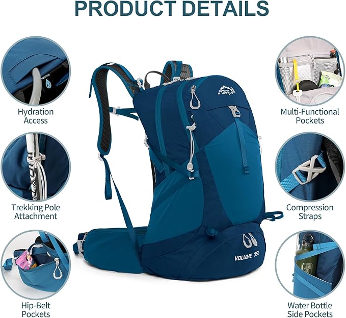 Hiking Backpack,35L Waterproof Hiking Daypack with 3L Water Bladder and Rain Cover, Lightweight Travel Camping Backpack for Men Women (Blue)