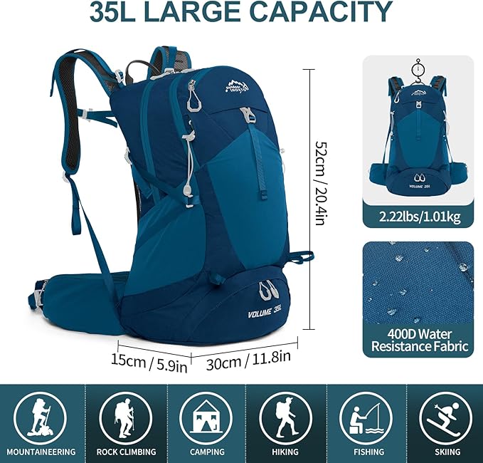 • 【Ergonomic Breathable Technology】Our Camping Backpack are 20.4 x 11.8 x 5.9 inches, 35L. Features a cutting-edge 3D touch suspension system that keeps your back comfortable and relaxed during travel. Breathable mesh on the back fabric can reduce sweating for extra comfort. Using steel frame support, the force is more evenly distributed, effectively alleviating the problems of muscle soreness caused by long-term weight bearing. Reflective design increases visibility and makes it safer at night.