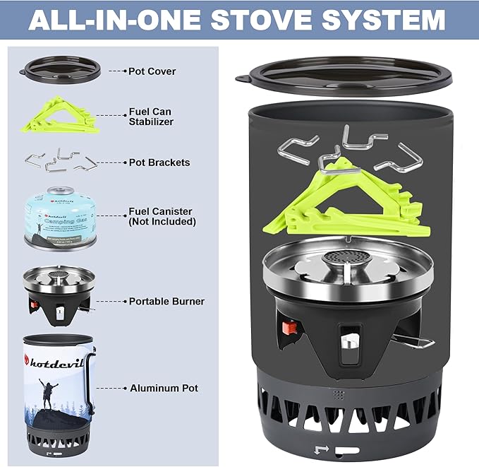 • Lightweight and Compatible: This backpacking stove works with international standard fitting (EN417 7/16’’). You can pack all accessories into this aluminum cooking pot. Easy to pack up, weighs only 17 oz, the portable camping stove can be a necessity for easy travel. Whatever you are preparing for boiling coffee, soup or water, it meets all your need.