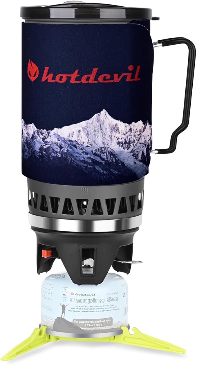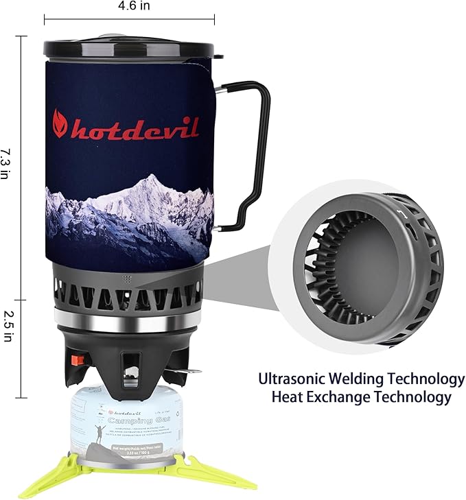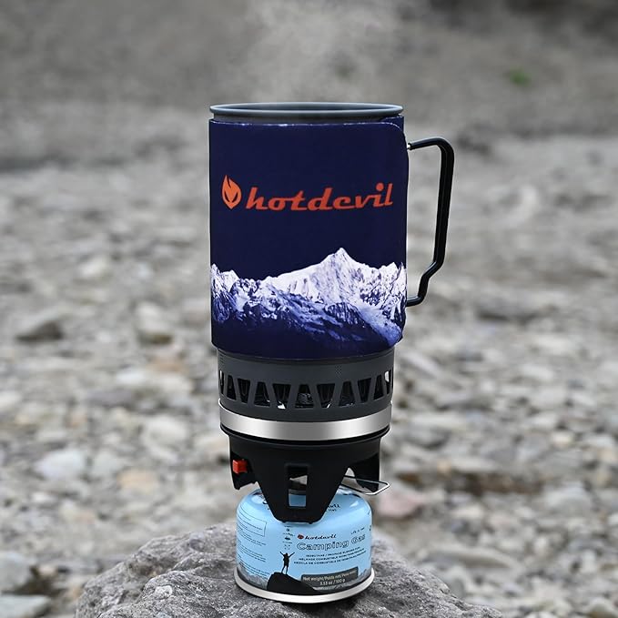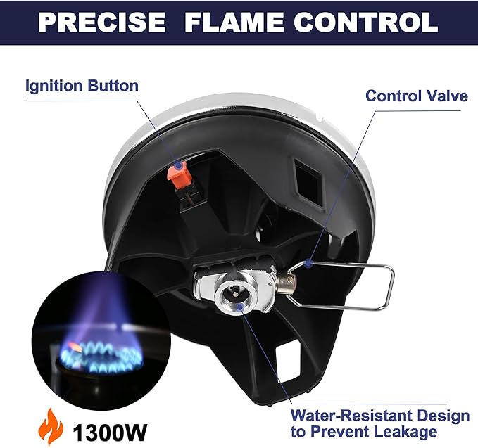 • High Efficiency: Boil 1L litre water in a lightning few minutes with half the fuel consumption of traditional systems. Output power: 1.3KW. Advanced windproof technology and heat exchange technology, not only minimize the impact of wind, but also maximize the efficiency. Even at extreme altitudes or cold areas, consistent performance can also be guaranteed.