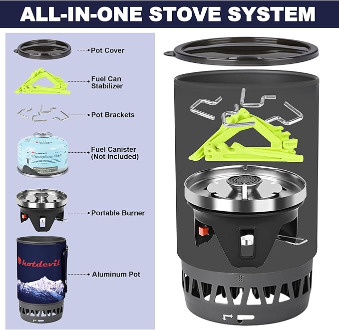 1.4L Backpacking Camping Stove Cooking System with Piezo Ignition, Outdoor Portable Burner with Pot & Brackets Camp Stove Camping Stove Kit Propane, Ideal for Hiking Fishing Hunting Emergency