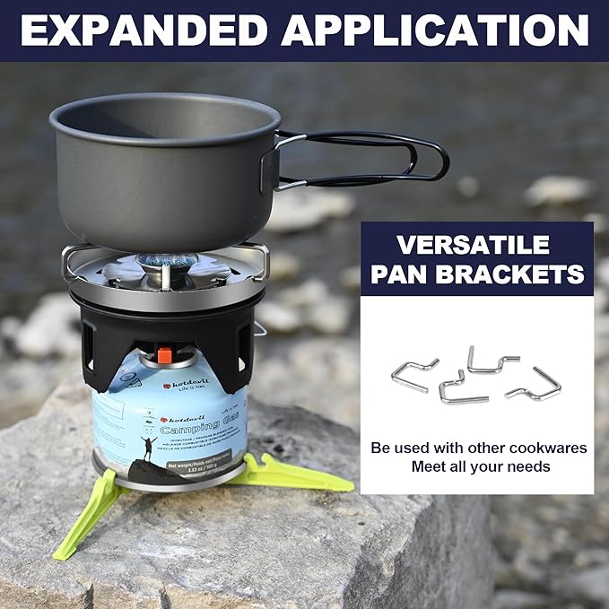• 1.4 Litre Cooking System:A high-quality gas burner, a pot, a fuel canister stabilizer and 4 pot brackets are included as an integrated backpacking stove cooking system. Turn on gas knob and heat can start instantly with a reliable piezoelectric igniter. If you want to use other cookwares, 3 pot brackets help you explore more cooking possibilities.