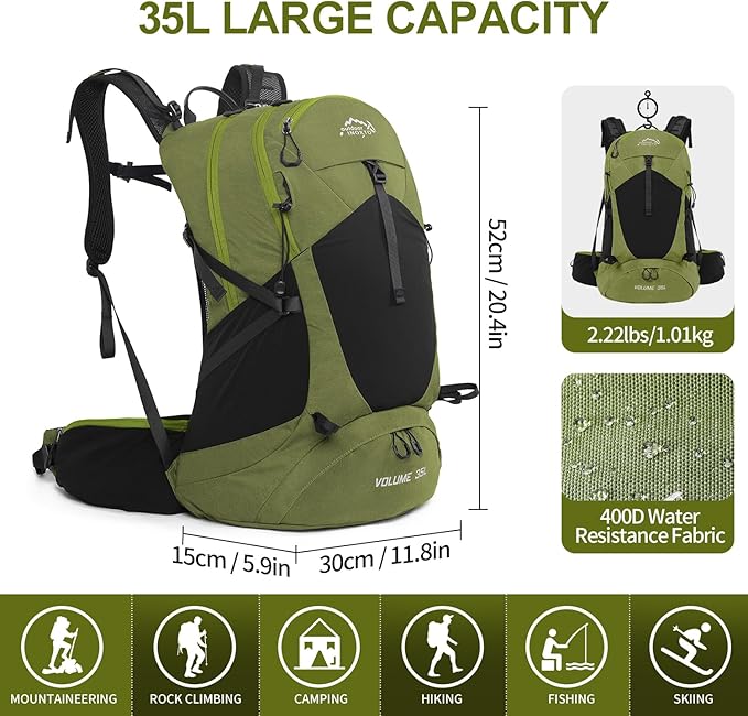 • 【Ergonomic Breathable Technology】Our Camping Backpack are 20.4 x 11.8 x 5.9 inches, 35L. Features a cutting-edge 3D touch suspension system that keeps your back comfortable and relaxed during travel. Breathable mesh on the back fabric can reduce sweating for extra comfort. Using steel frame support, the force is more evenly distributed, effectively alleviating the problems of muscle soreness caused by long-term weight bearing. Reflective design increases visibility and makes it safer at night.