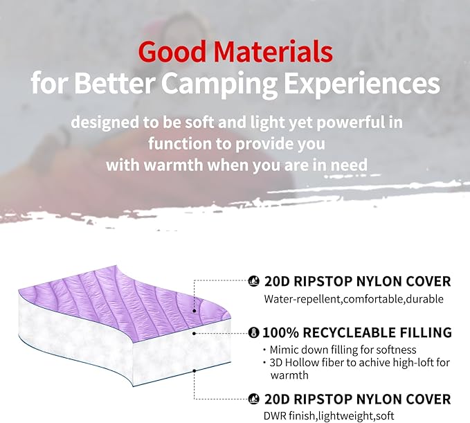 • Water Repellent & Easy Care: Made from nylon coated shell, the down-like camping blanket can withstand water, sand, dirty, wind and etc. Even if you are in a windy condition, warmth is still around you. As for cleaning, just wipe it with wet wipes for light stain. Machine wash on a gentle cycle low is better for deeper cleaning