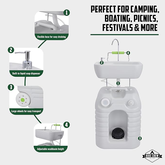 • PERFECT FOR CAMPING, BOATING & FESTIVALS | Hike Crew’s Versatile Personal Care Equipment Stands Up to Frequent Use & Suits a Variety of Outdoor Settings & Events Where Plumbing/Running Water is Not Available | Use Your Portable Sink & Water Tank for Camping & Fishing Trips, RV Outings, Picnics, Concerts, Parties, Tailgates & Sporting Events