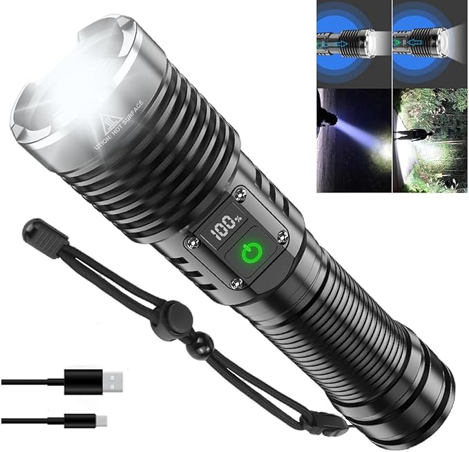 • 🔦【LCD POWER DISPLAY& LONG LASTING】This super bright flashlight high lumens has been newly upgraded with the unique LCD power percentage display, at a glance,you can always grasp the remaining power.As well, this flash light has been completely improved to shorten the charging time and extend the service life, which can provide up to 8 hours of powerful, non-diminishing brightness.