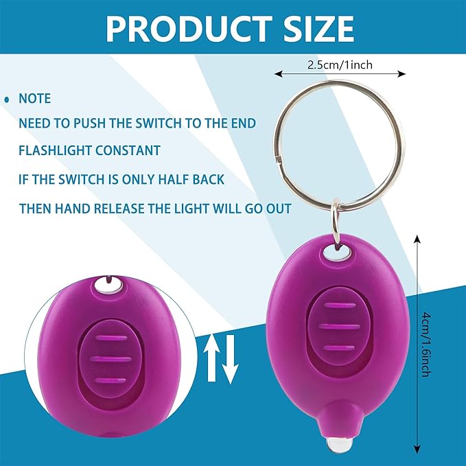 • Package includes: you will get 10 pieces of purple mini flashlight keychains, perfect for parties, emergencies or daily use. Its vibrant purple color adds a touch of style to your everyday essentials
