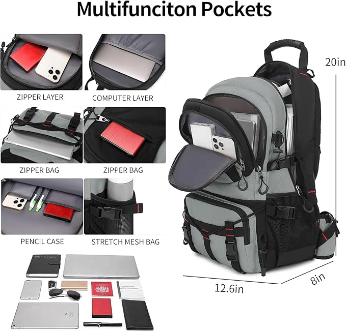 • Large Capacity: With 40L storage space, this backpack features with multi-compartment design includes one main zipped compartment, several front pockets with zippers and two side pockets. Large capacity helps you easily organize all your essential items.