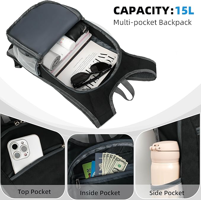 Hiking Backpack 15L Small Travel Backpack Lightweight Daypack Foldable Hiking Backpack Packable Camping Hiking Backpack for Women Men (Black)