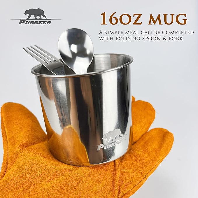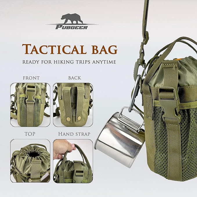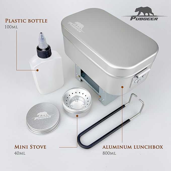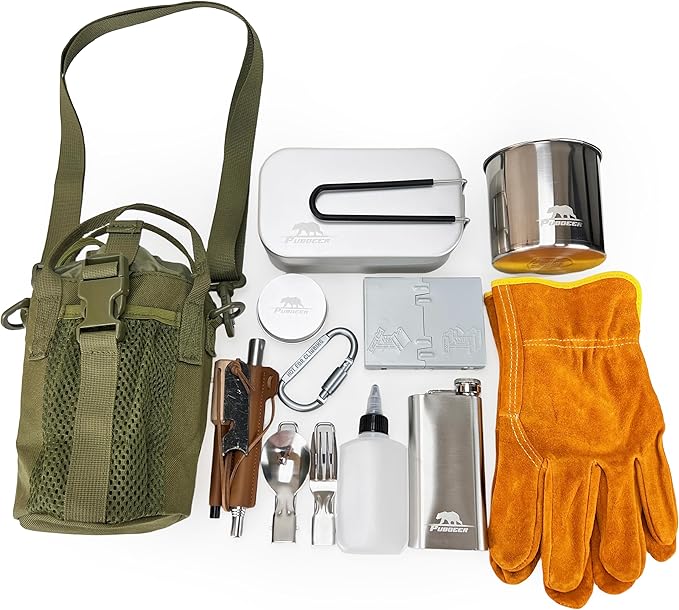 • Kit Contents: Includes an Oxford cloth crossbody bag, 800ml aluminum lunchbox, 16oz folding stainless steel mug, portable stainless steel fork and spoon, fire starter and air blower, collapsible stove stand and mini stove, plastic bottle, flask, leather heat-resistant gloves, and a carabiner