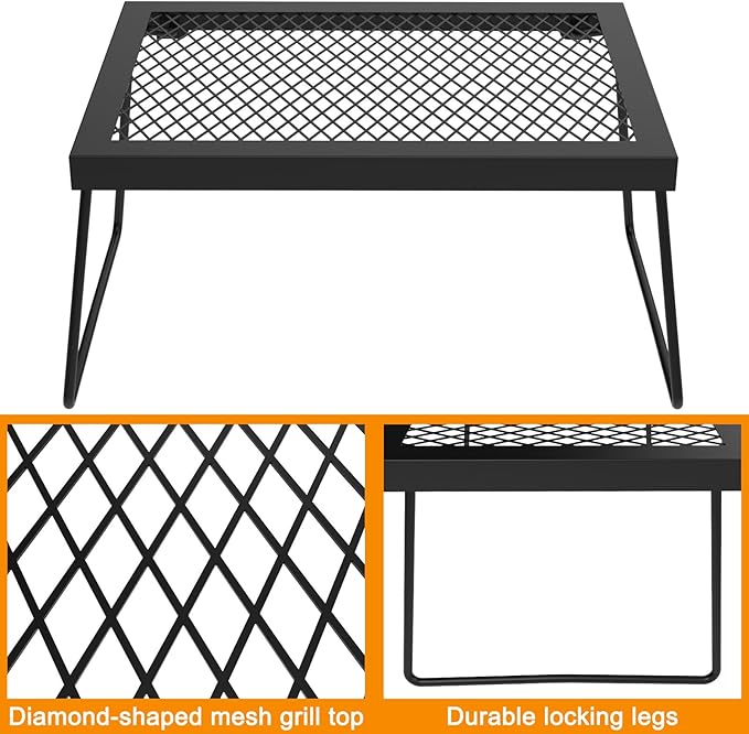 • 🔥 High-Density Diamond-Shaped Grill Mesh: Featuring a high-density diamond-shaped grill mesh, this campfire cooking grate ensures uniform heat distribution for perfectly cooked meals every time. Upgrade your outdoor cooking setup with this essential camping accessory for outside adventures.