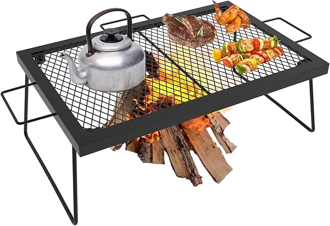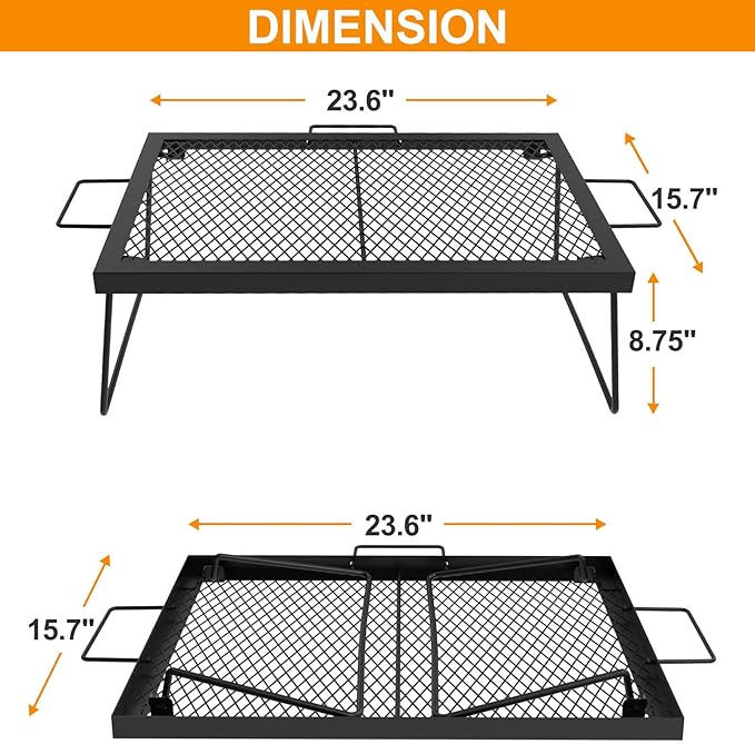 • 🔥Sturdy Solid Iron Stand: Crafted from durable solid iron, our campfire grill grate is built to last, providing a strong and stable platform for all your outdoor cooking adventures. ✅Dimensions: Unfold size: 23.6" x 15.7" x 8.75"; Folded size: 23.6" x 15.7".