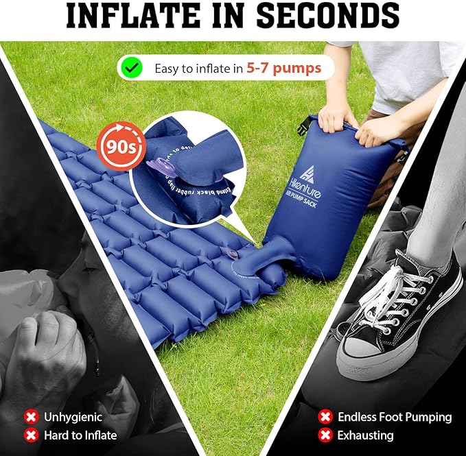 • INFLATE QUICKLY WITH JUST 7 PUMPS USING THE INCLUDED PUMP SACK: Forget about tiring mouth blowing or foot pumping. Our two-person camping mattress comes with a pump sack that inflates the pad in just 6-8 pumps. Thanks to the patented two-way valve, anyone can easily inflate or deflate this sleeping pad in seconds. The internal black plug allows you to adjust the firmness to your preference.