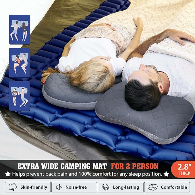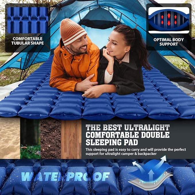 • NO MORE WAKING UP ON HARD GROUND: Made from camping-grade ripstop fabric, our double camping pad is suitable for various terrains and built to last a lifetime. Unlike other cheap PVC materials, our inflatable sleeping pad features a laminated poly pongee surface and waterproof TPU coating, offering superior comfort, tear resistance, and water resistance.