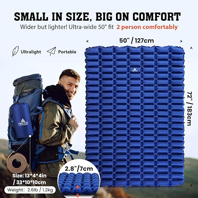 • THE BEST ULTRALIGHT COMPACT SLEEPING PAD FOR TWO: Weighing only 2.8 lbs, this inflatable sleeping pad packs down to a compact 13x4 inches, about the size of a water bottle. The Hikenture lightweight sleeping pad provides excellent back and lumbar support, preventing any discomfort while you sleep in a tent or outdoors. After a day of backpacking, hiking, climbing, camping, or traveling, you can rest wherever you lay down.
